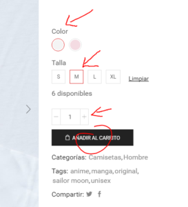 No es tan difícil, solamente tenés que darle clic al color que querés, luego la talla, la cantidad y por último das click en «añadir al carrito.» Te va a salir una notificación de que ya añadiste los productos al carrito y el total y cantidad de productos se actualizará. Podés seguir mercando y repetir esto cuantas veces sea necesario.