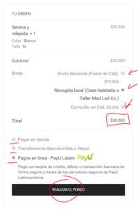 Aquí podés elegir cómo pagar y de qué manera querés que te entreguemos las camisetas. En Mad Lad Co. podés pagar en línea con PayU, hacernos una transferencia a bancolombia o pagar en tienda. Acordáte de elegir como querés recibir tu camiseta. Cuando estés seguro, llená todos los datos necesarios en formulario que nos van a servir para enviarte el producto y dale clic en «Realizar el Pedido» (Si elegiste pagar con PayU, seguí en el punto 4).Si elegiste «Pago en tienda» o «Transferencia Bancolombia o Nequi», recordá cancelar o transferir el valor total del pedido junto con el envío si aplica. Luego ya te mostrará la pantalla de confirmación del recibo del pedido.